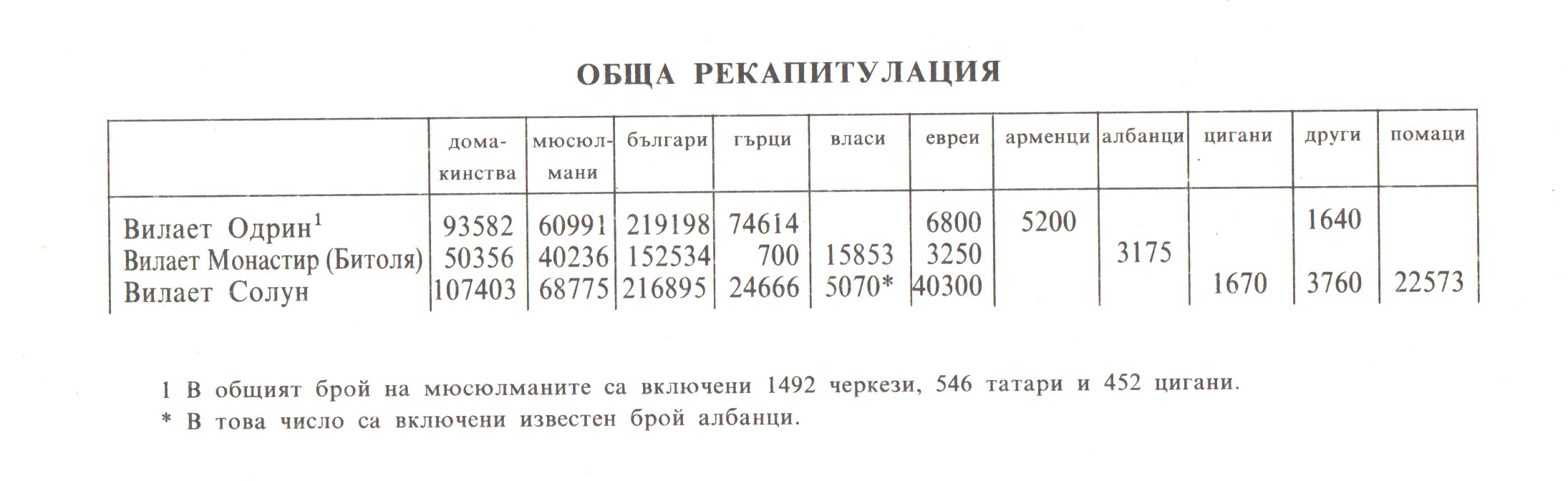 Тук публикуваме ОБЩАТА РЕКАПИТУЛАЦИЯ на населението в трите вилаета по етнически групи.